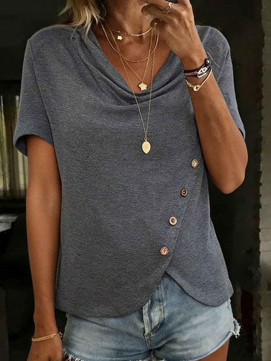 Women's Elegant Solid Color Ruffled Collar Button 100% Cotton Short-sleeved T-shirt